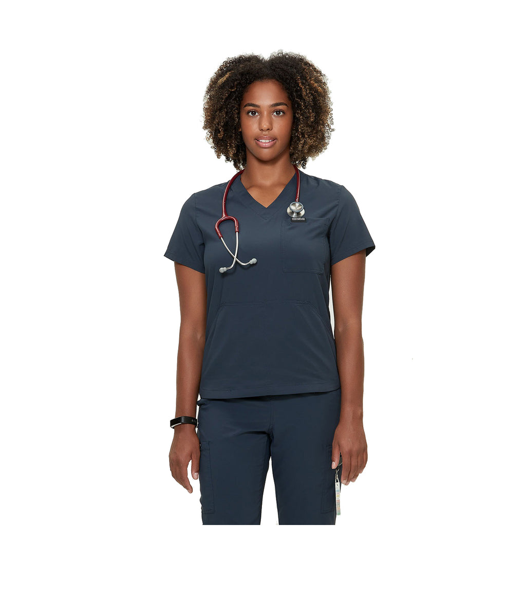 Cette chemise médicale pour femme rendra vos journées de travail plus confortables. Elle est munie d'une poche kangourou pratique séparée en 2 sections. Grâce à son traitement déperlant DWR, la matière est résistante à l’eau, elle sèche rapidement et un fini antimicrobien offre une excellente protection contre les odeurs dues à la transpiration. Fini le repassage avec son tissu extensible composé à 100% de polyester. Cet uniforme d'infirmière deviendra certainement un incontournable dans votre garde-robe de travail.